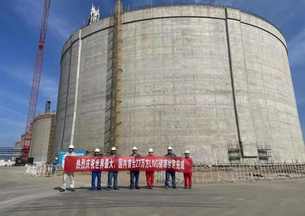 中国石化天然气分公司青岛LNG接收站,是中国石化首座LNG接收站,也是山东省目前唯一投运的LNG接收终端,供气范围覆盖鲁、苏、皖、冀、豫等省份,是我国华北地区主力天然气源之一。该27万立方米LNG储罐属于青岛接收站三期工程,直径100.6米、高55米,相当于1个足球场的面积、20层楼的高度,预计今年11月将正式投入使用。